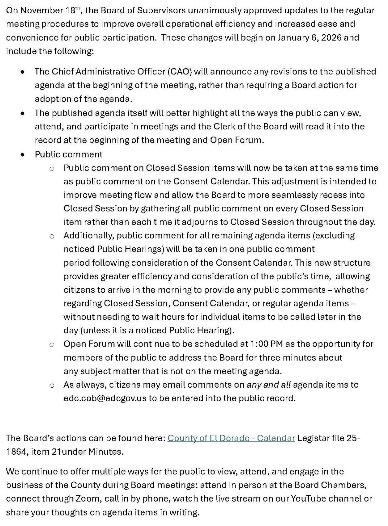 Some changes take effect on Jan. 6th to help make Board meetings more efficient and to assist the public in planning how to participate in the meetings. As always, the BEST way to ensure your comments are captured into the official record is to send them via email to edc.cob.edcgov.us. Read the detailed meeting changes here. Register to receive updates like this from the County's email notification system, GovDelivery, by clicking here.